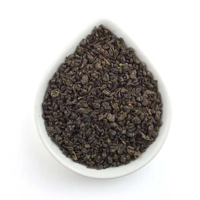 Зеленый китайский чай высшего качества.  Листья чая скручены как зерна пороха. Зеленый листовой чай в форме шариков – это освежающий напиток, несколько горьковатого вкуса и превосходного аромата.