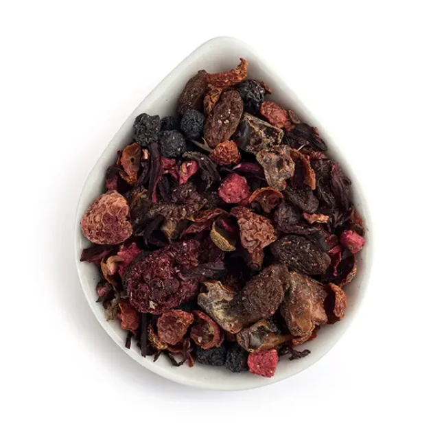 Чай, вкус которого полностью соответствует своему названию. В составе: лепестки гибискуса, ягоды бузины, изюм, вишня, натуральный аромат.