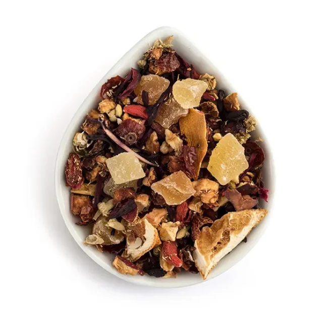 Чай, вкус которого полностью соответствует своему названию. В составе: лепестки гибискуса, ягоды бузины, изюм, вишня, натуральный аромат.