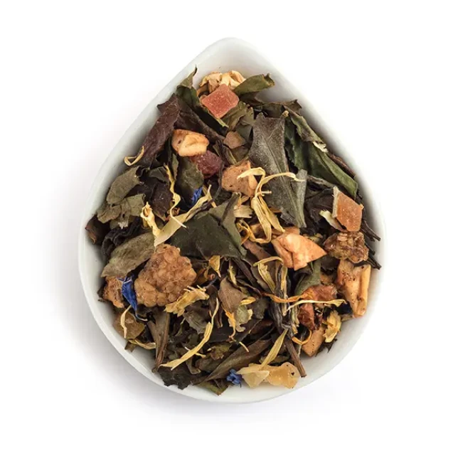 Белый чай Pai MuTan, кусочки папайи, кусочки яблока, ягоды шелковицы, цветки ноготка, цветки жасмина, цветки василька, натуральный ароматизатор.